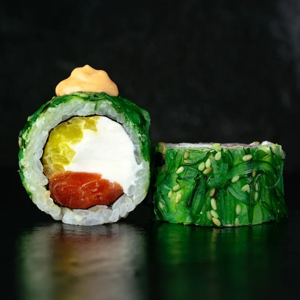 Состав: рис, нори, сыр, подкопченная форель, маринованная редька "Такуан", чука, соус "Спайси".