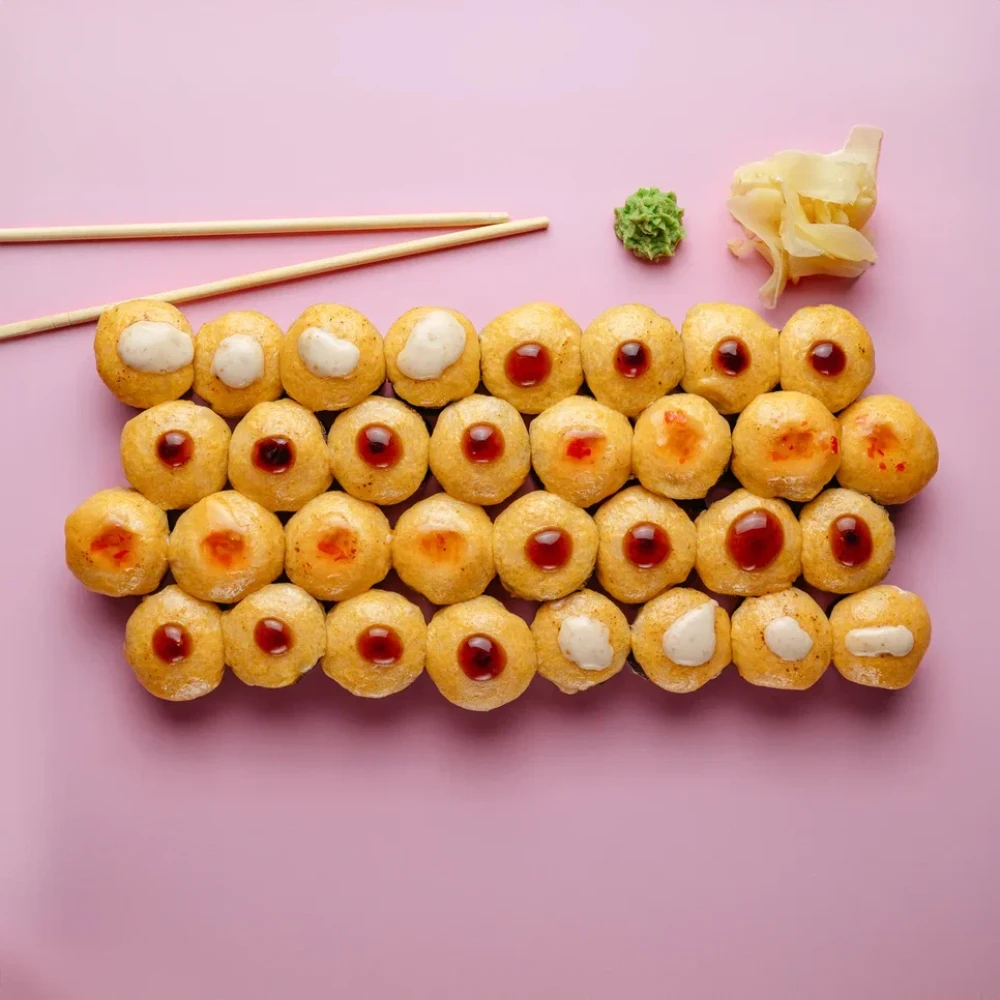 Состав: ролл "Вулкан с креветкой", ролл "Вулкан с тунцом", ролл "Вулкан с цыплёнком", ролл "Вулкан с форелью".