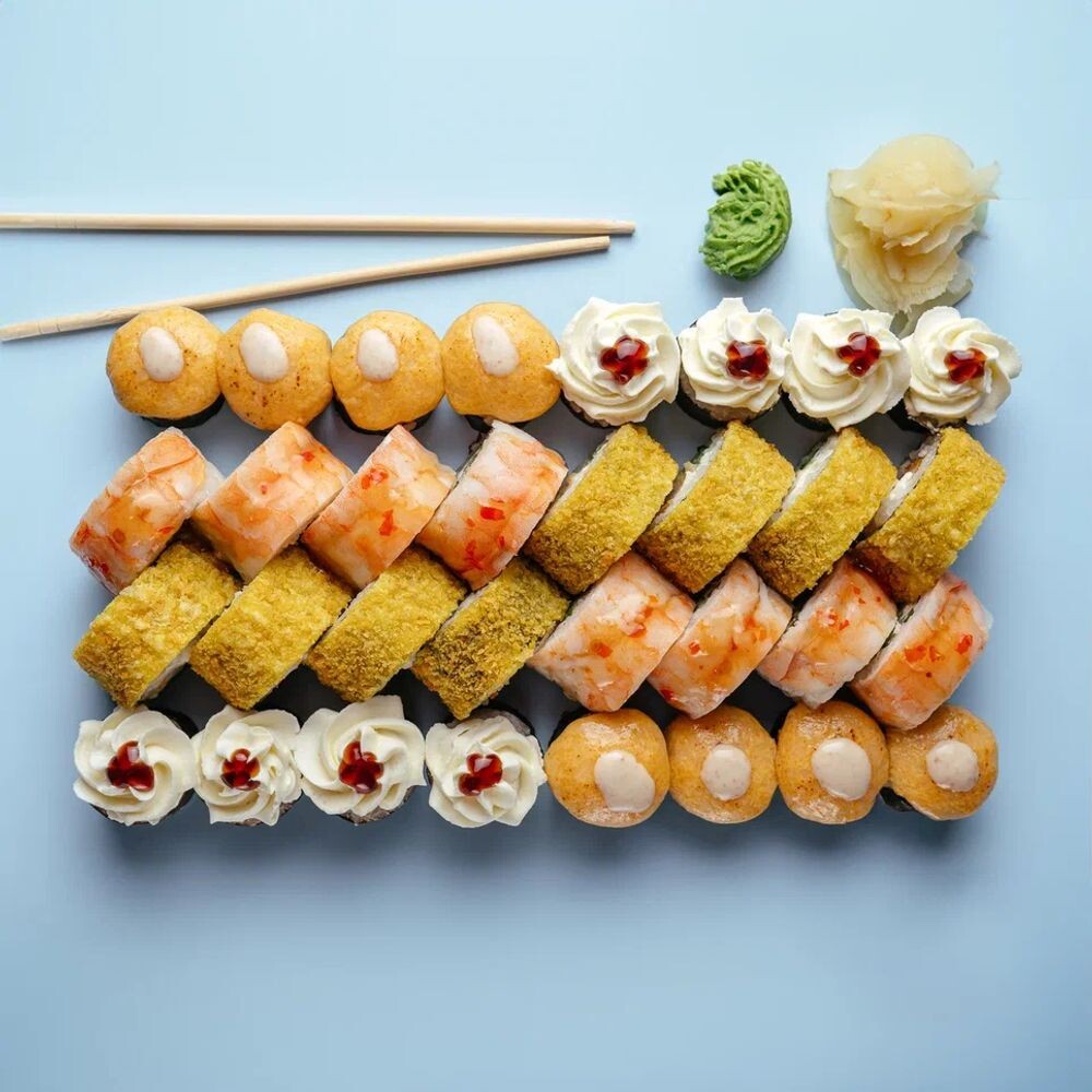 Состав: ролл "Эбико", ролл "Сливочный с форелью", ролл "Темпура чикен", ролл "Вулкан с форелью".