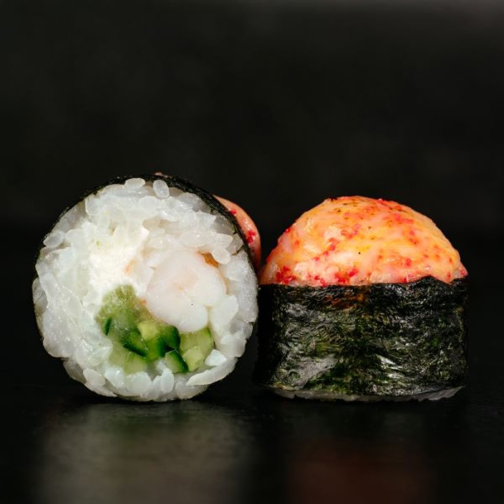 Состав: рис, нори, огурец, тигровая креветка, сырная "Шапка" (сыр, икра "Масаго", майонез, соус "Шрирача"), соус "Унаги".