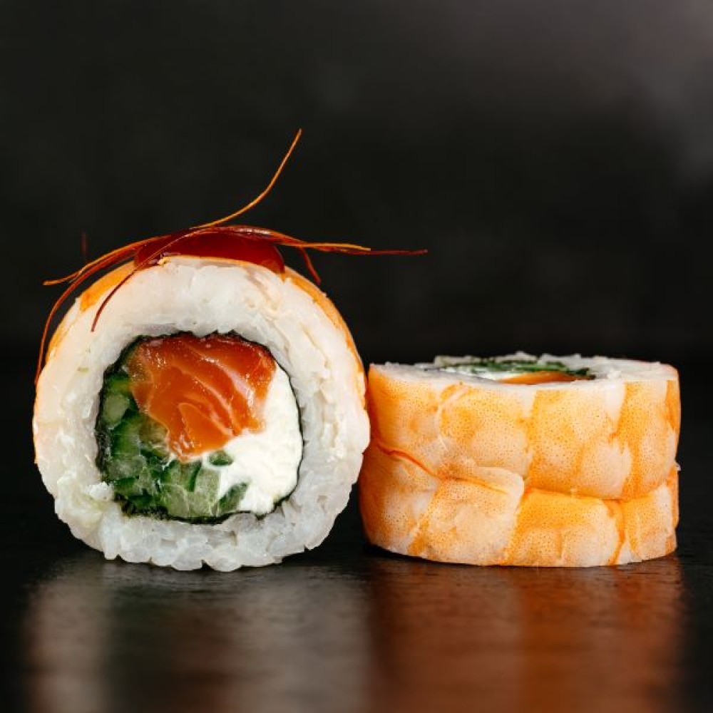 Состав: рис, нори, сыр, форель, огурец, креветка тигровая, нити чили, соус "Устричный".