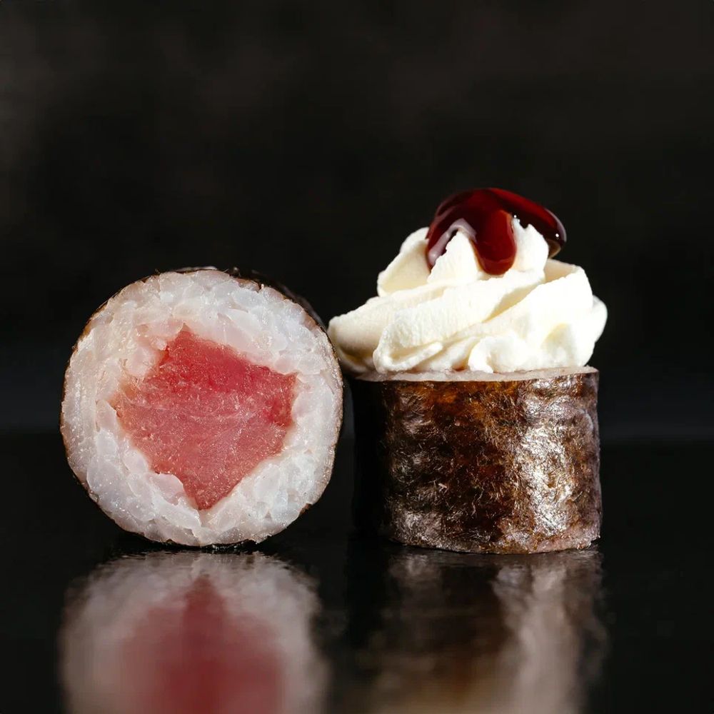 Состав: рис, нори, тунец, сыр творожный, соус "Унаги".