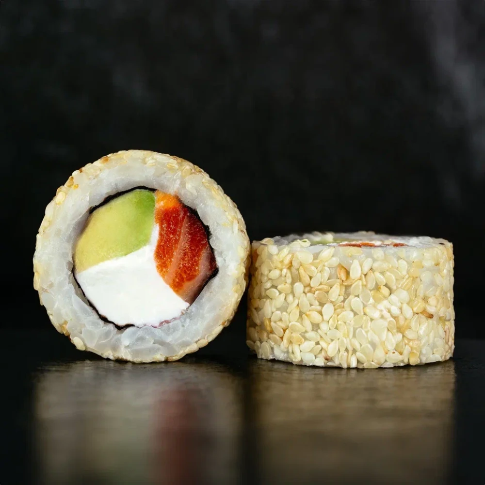 Состав: рис, нори, форель, сыр творожный, авокадо, белый кунжут.