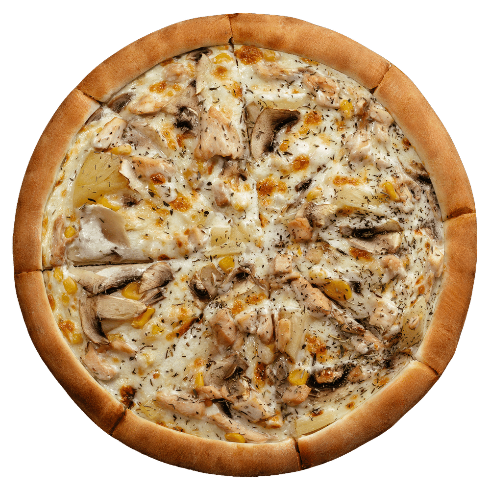 Состав: тесто, грибной соус, моцарелла, цыплёнок, грибы, ананасы, кукуруза.