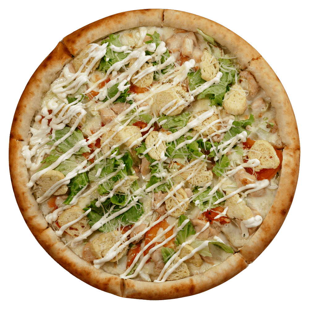 Состав: тесто, соус "Сливочно-чесночный", моцарелла, помидоры, цыплёнок, соус цезарь, сухарики, салат, пармезан.