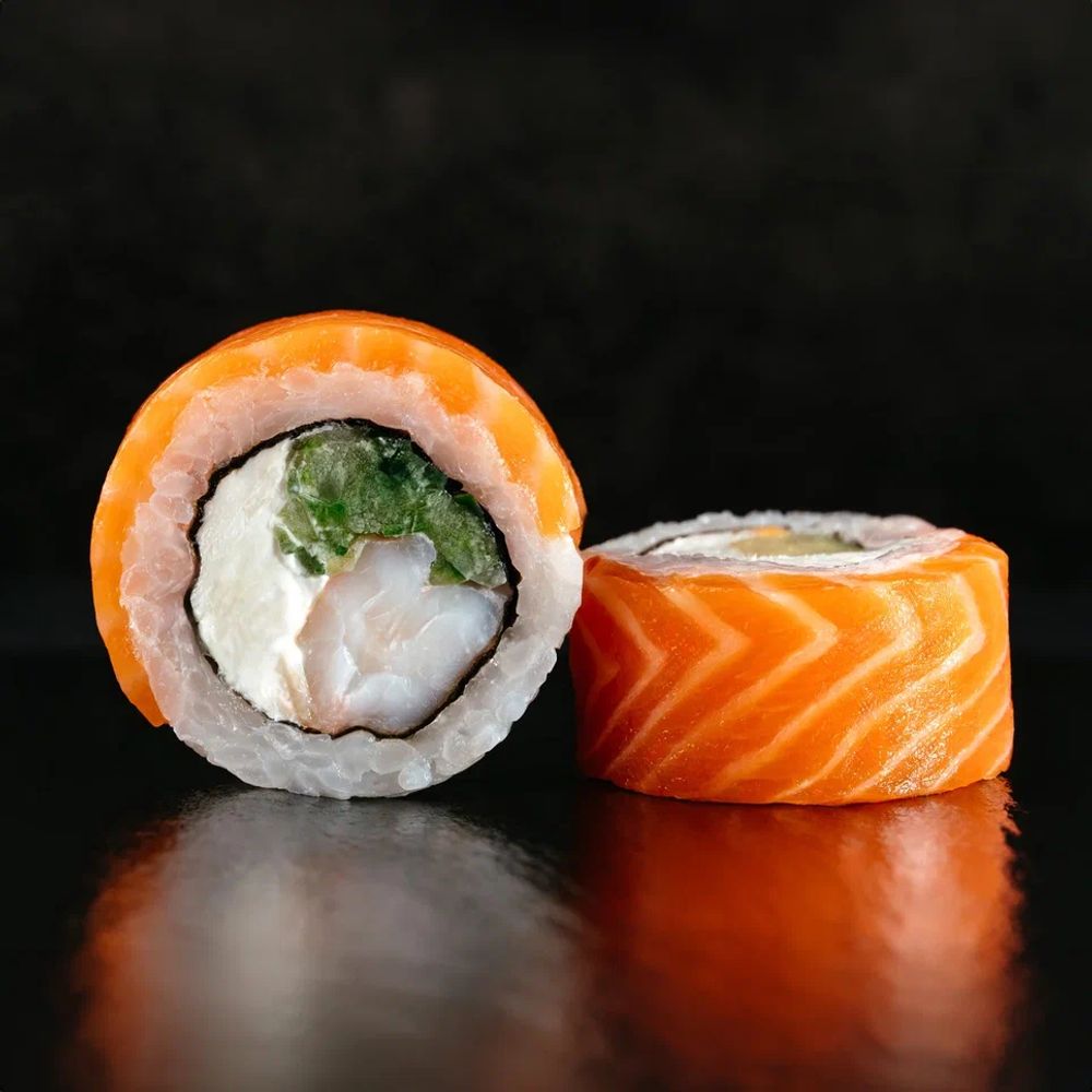 Состав: рис, нори, форель, сыр творожный, тигровая креветка, огурец.